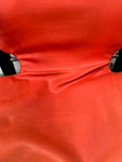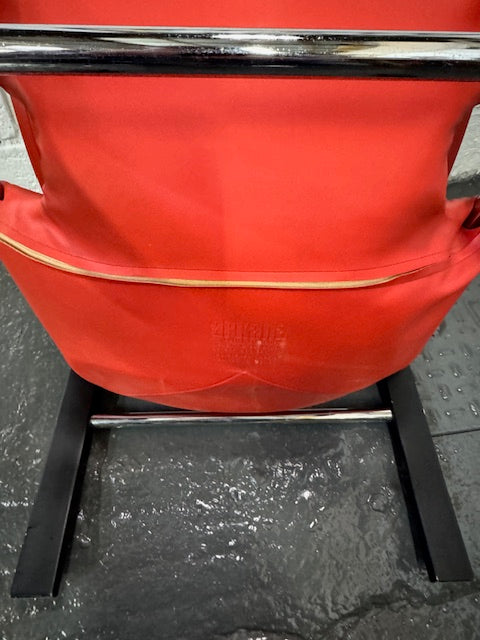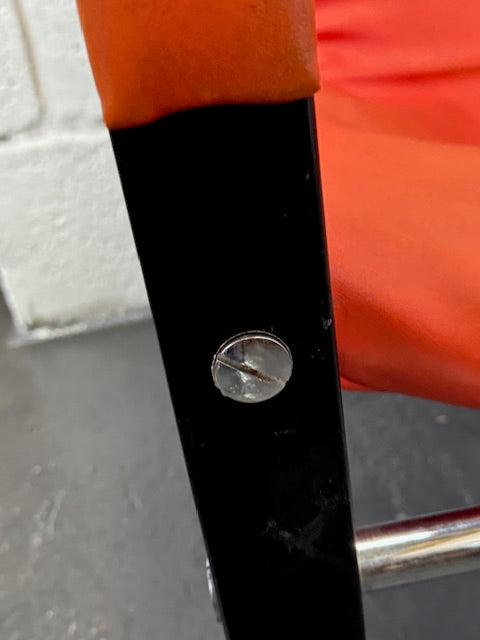 Comfortable, solid construction, beautiful silhouette. Legs are black lacquered beechwood with tubular chrome/steel frame and a orange leatherette (naugahyde) seat. Its age shows—marks on the leatherette, chrome, and legs as pictured. Priced accordingly. Still a beautiful addition to any lounge, and much better quality and design than any modern chair you'll buy today.