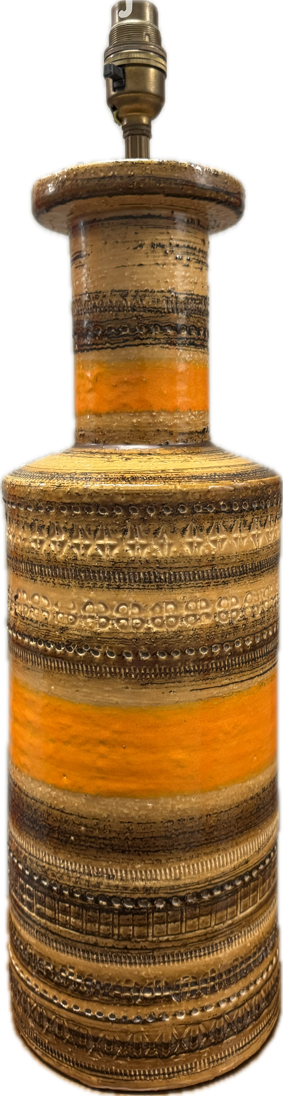 The lamp is adorned with warm, relief-painted stripes in a rich palette of beige, brown, and orange. This harmonious color scheme enhances its textured surface, reflecting the artisanal expertise that defines Bitossi ceramics.