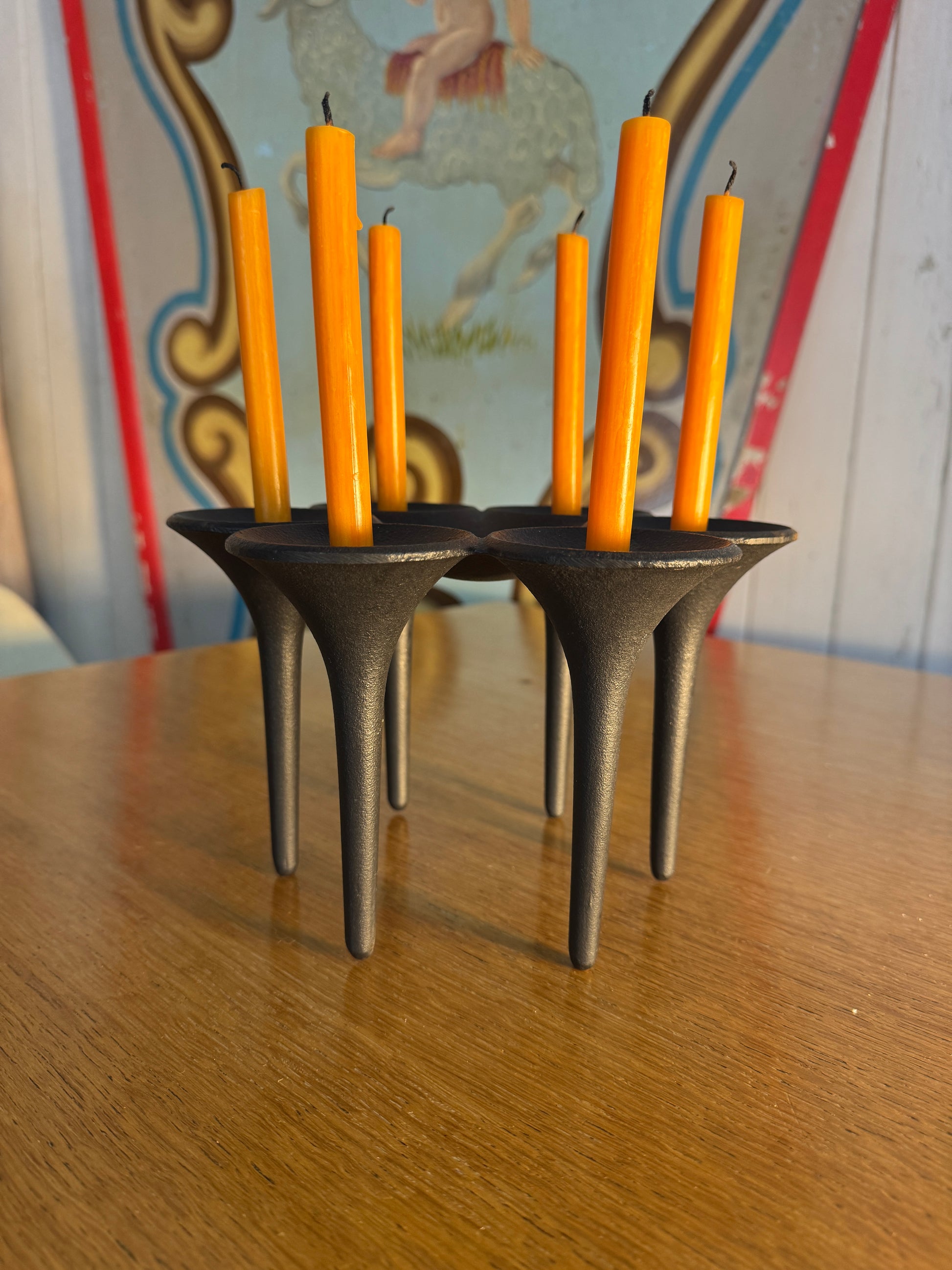 Cast in solid black iron, the Hornblower features bold sculptural lines with a strong, architectural presence — perfect for creating atmospheric, candlelit evenings. The substantial weight and quality casting reflect the durability and design integrity associated with mid-century Scandinavian metalwork.