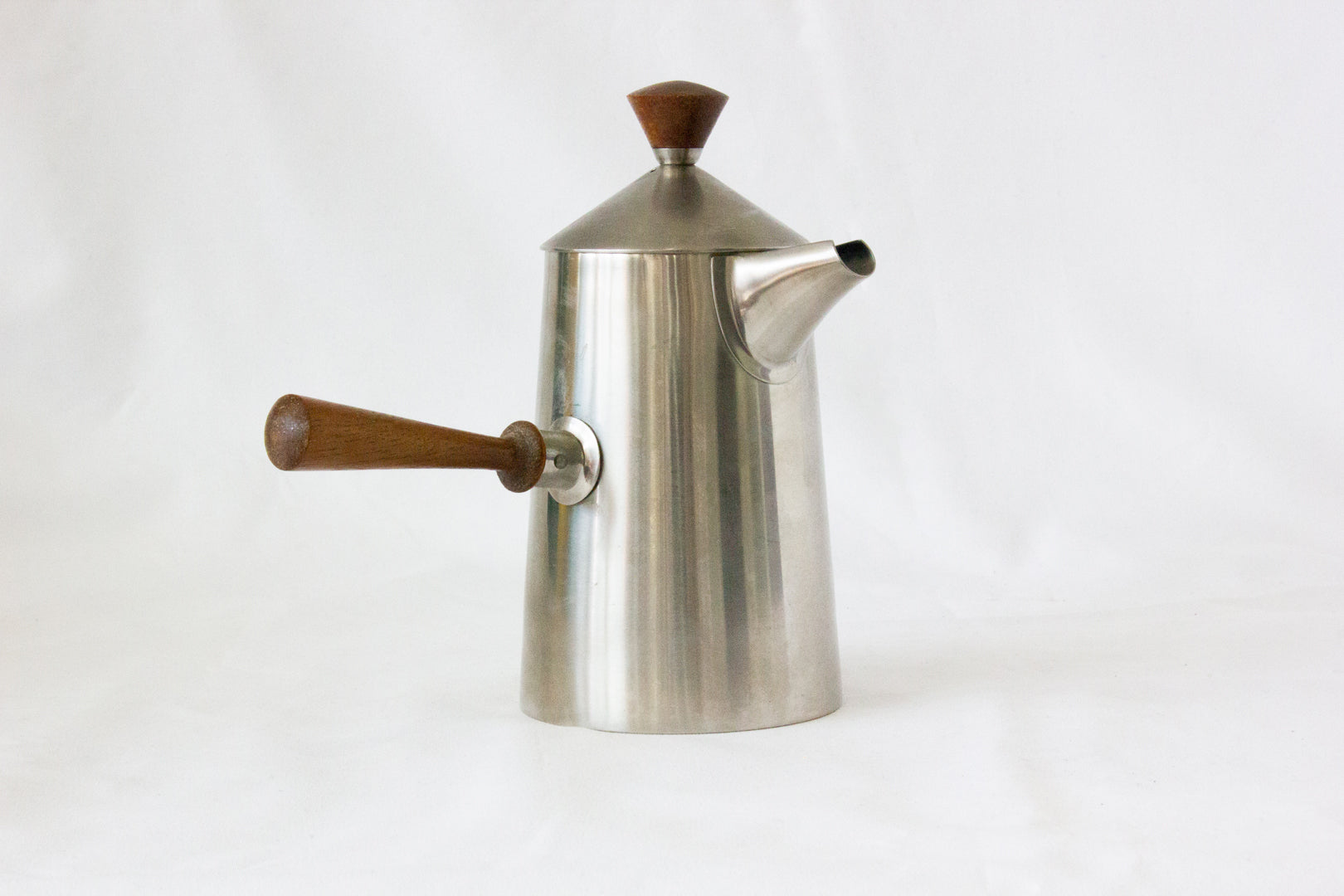Coffee-pot and milk jug from the 'Campden' range, stainless steel with turned wood handles placed at right angles to the spout, the lids with turned wood knobs, the coffee-pot with strainer behind the spout. The handle of coffee-pot placed to the right of the spout, that of the jug to the left, so that they can be poured together, one in each hand.
