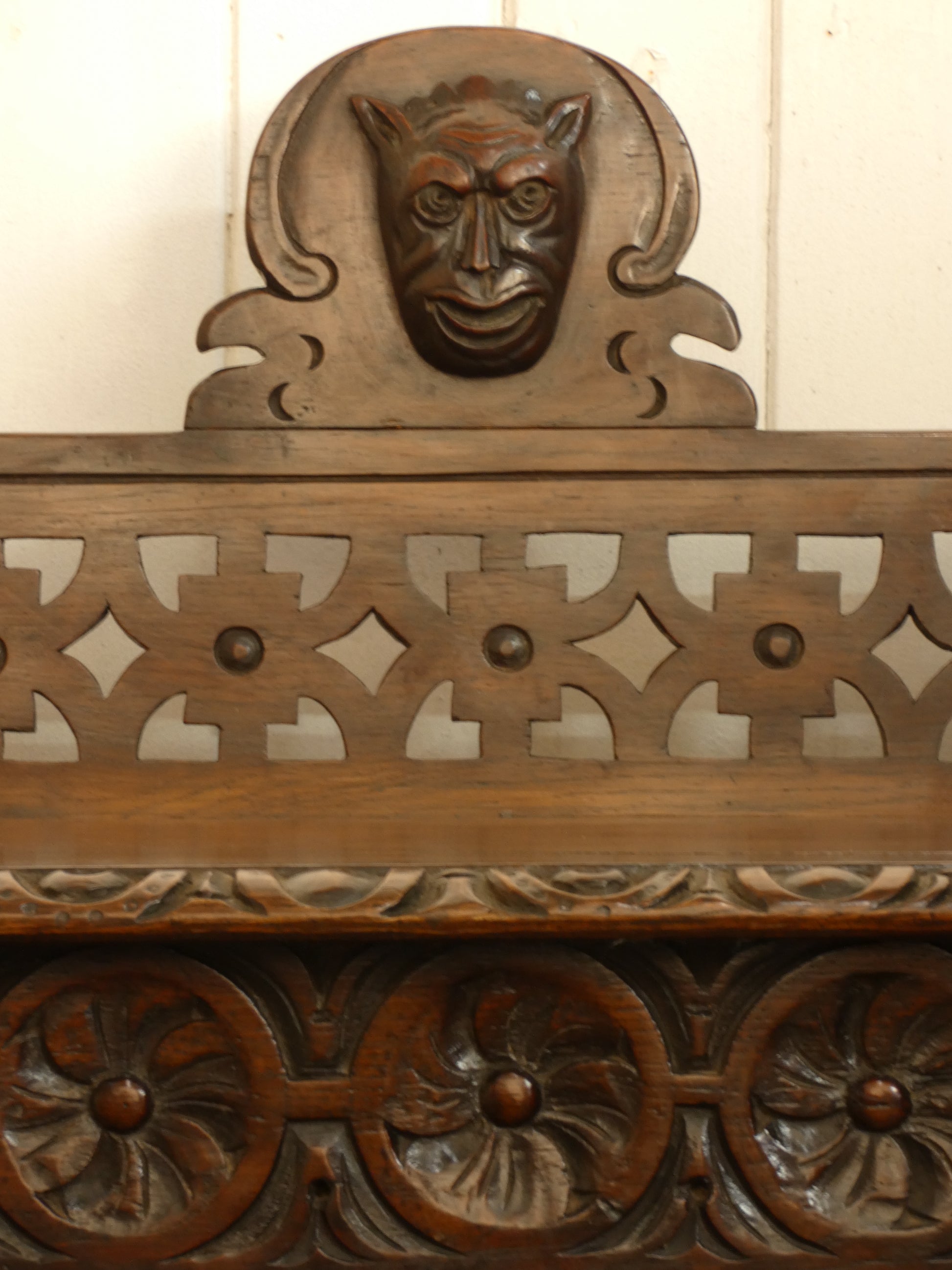 The bench features a pierced and carved gallery back, adding visual interest and strong architectural presence, while the solid oak construction gives it both durability and timeless appeal. Designed originally for use in a hallway or entrance, this piece works equally well in a traditional interior, country home, or period-inspired space.