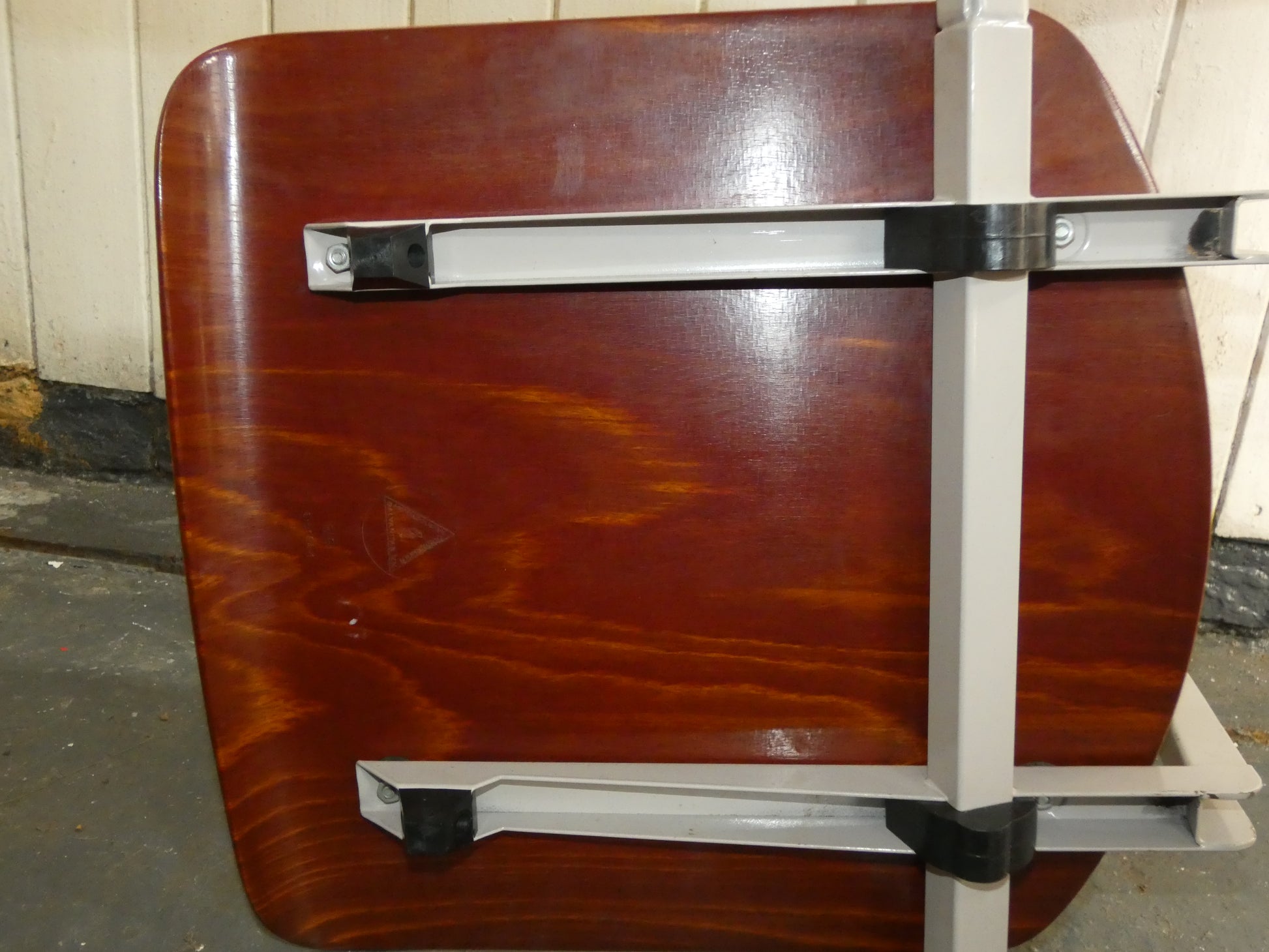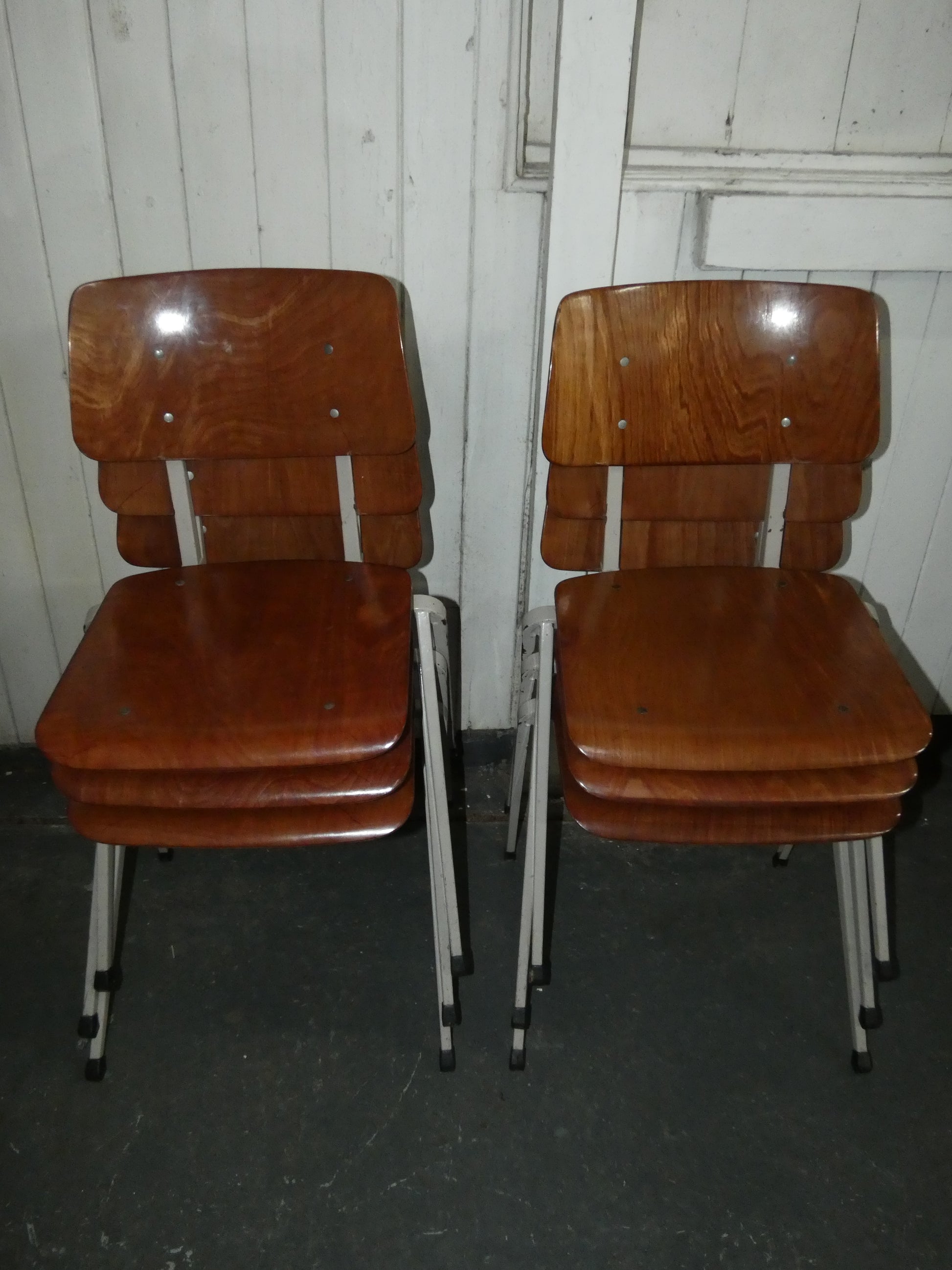 These original stacking chairs feature beautifully shaped warm brown wooden seats and backrests combined with a sturdy white metal frame, creating the perfect balance between industrial and Scandinavian-inspired design. Their clean lines and functional construction make them ideal for dining rooms, kitchens, studios, cafés, or vintage-inspired interiors.