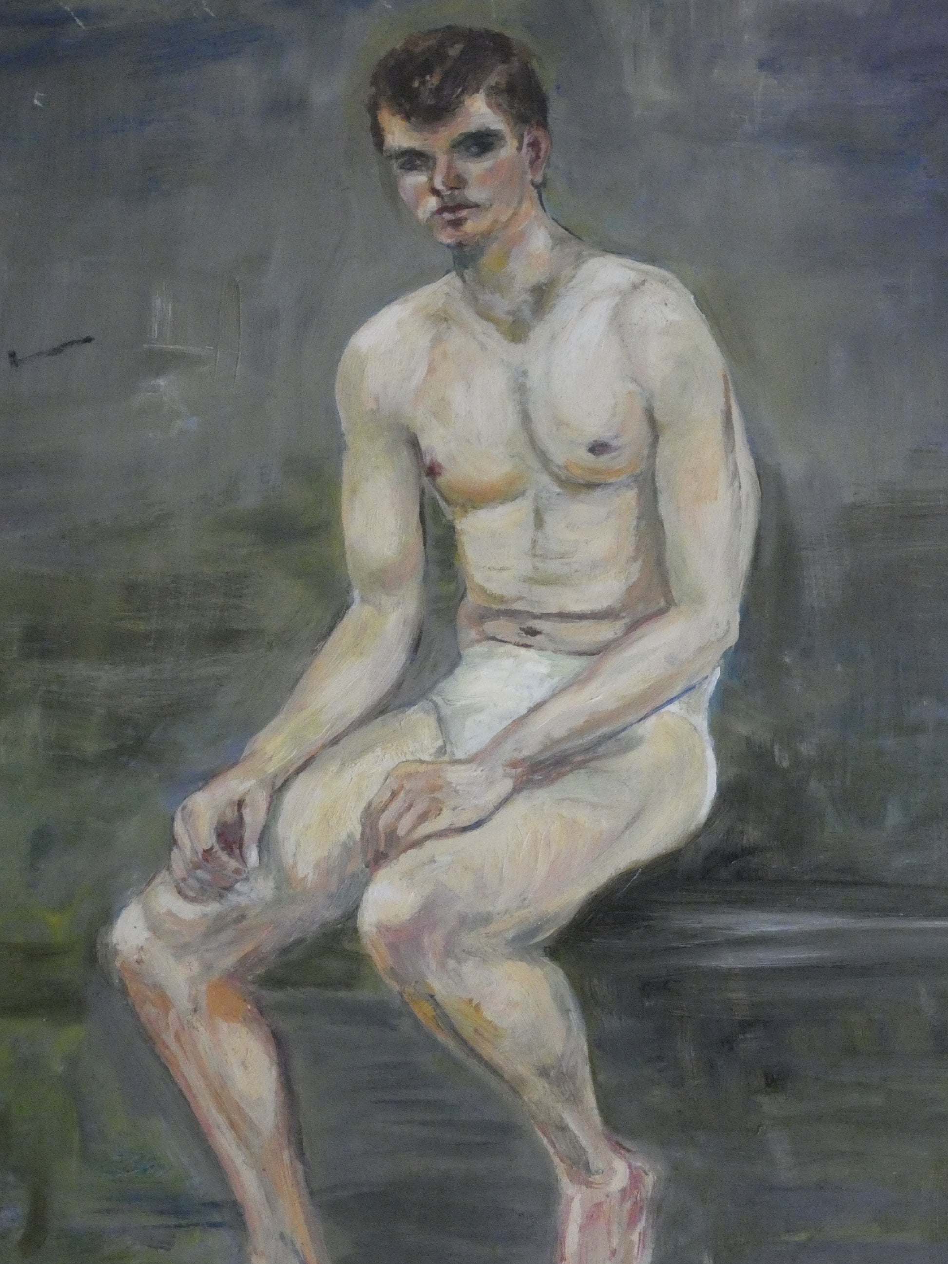 The composition shows a young man seated in a relaxed pose against a muted grey and green background. The artist focuses on the natural form of the body, using soft highlights and warm tones to model the musculature and posture. The painterly approach suggests a studio life study, a common practice in art academies during the mid-century period.