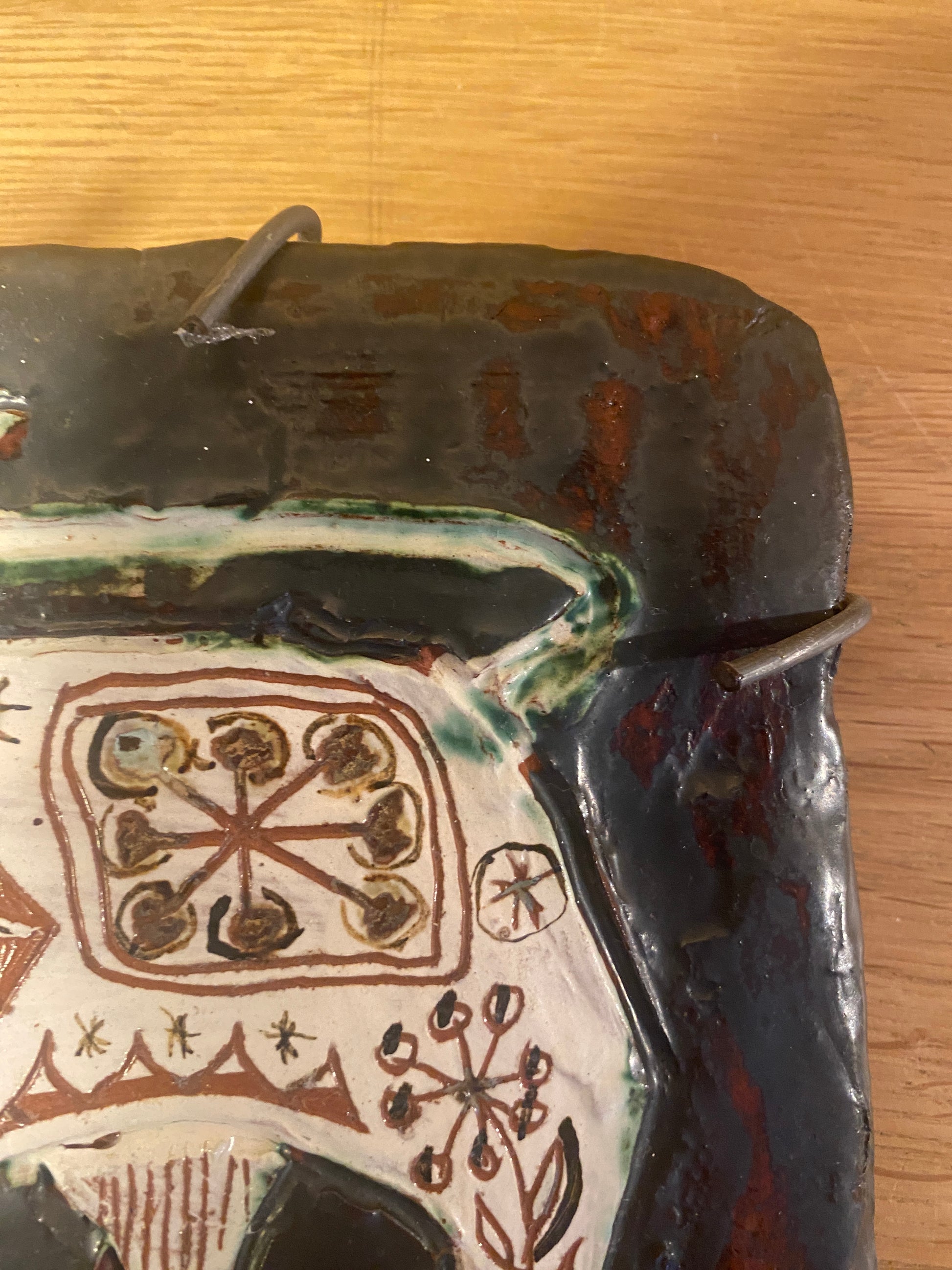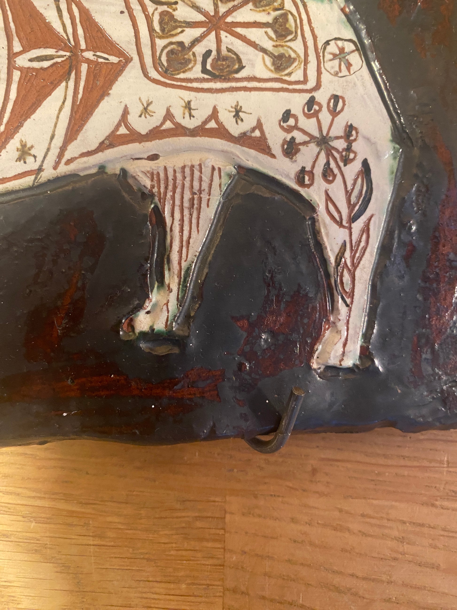 Would complement any MCM fans home - we love the way the horns come to life on the piece. No damage or ships and hung by a rather crude metal holder for wall use.
