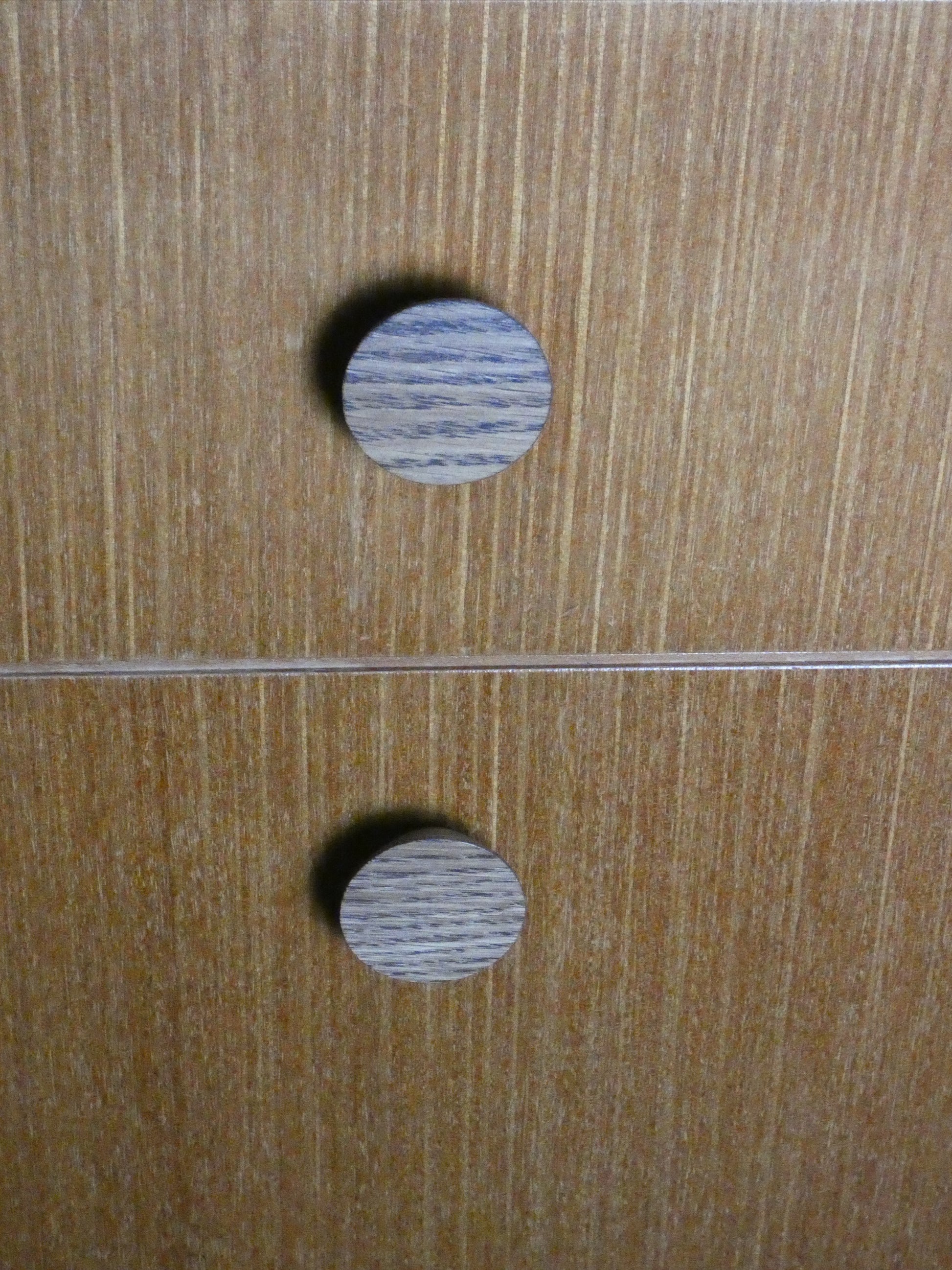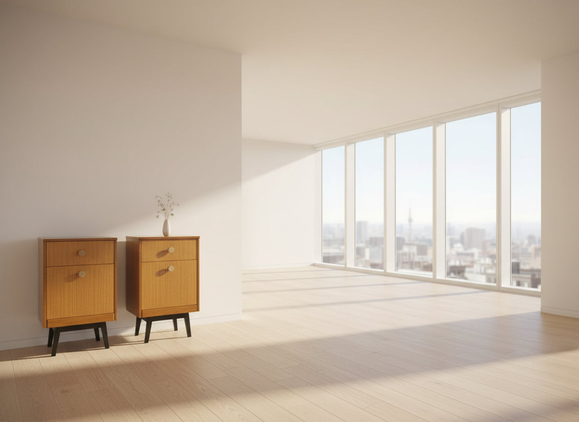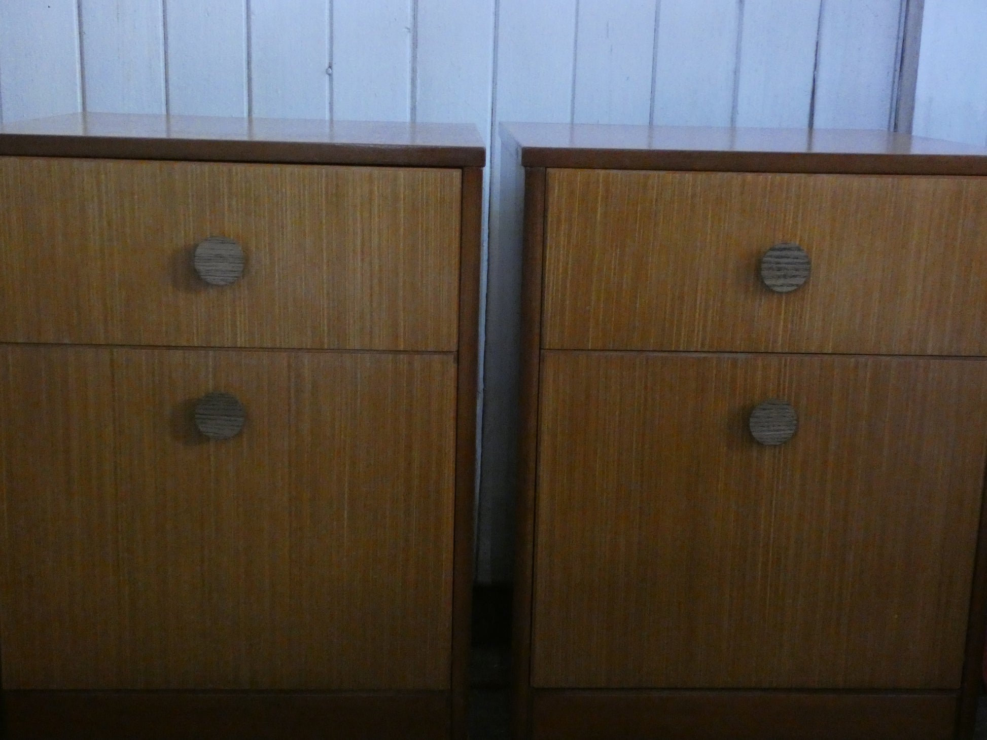 A rare and beautifully preserved pair of mid-century bedroom side tables, crafted from warm teak wood. This classic 1950s–60s design features clean lines, two spacious drawers, distinctive round wooden handles, and elegant black splayed legs—perfectly capturing the timeless appeal of the era.