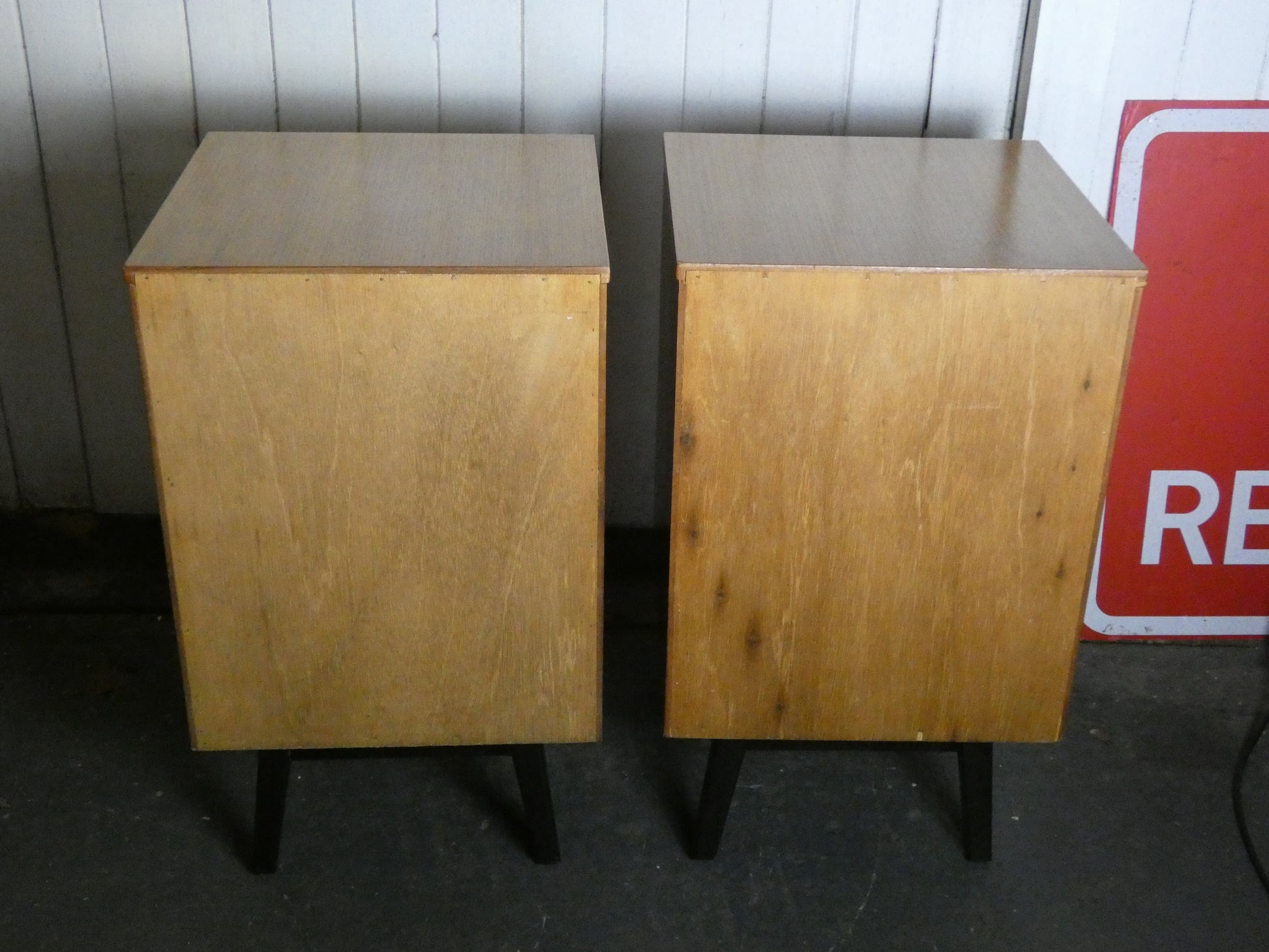These nightstands are reminiscent of designs by Jindřich Halabala for UP Zavody, though unmarked. Pairs like these are exceptionally hard to find—often we end up with just one! They make a striking addition to any mid-century modern bedroom.