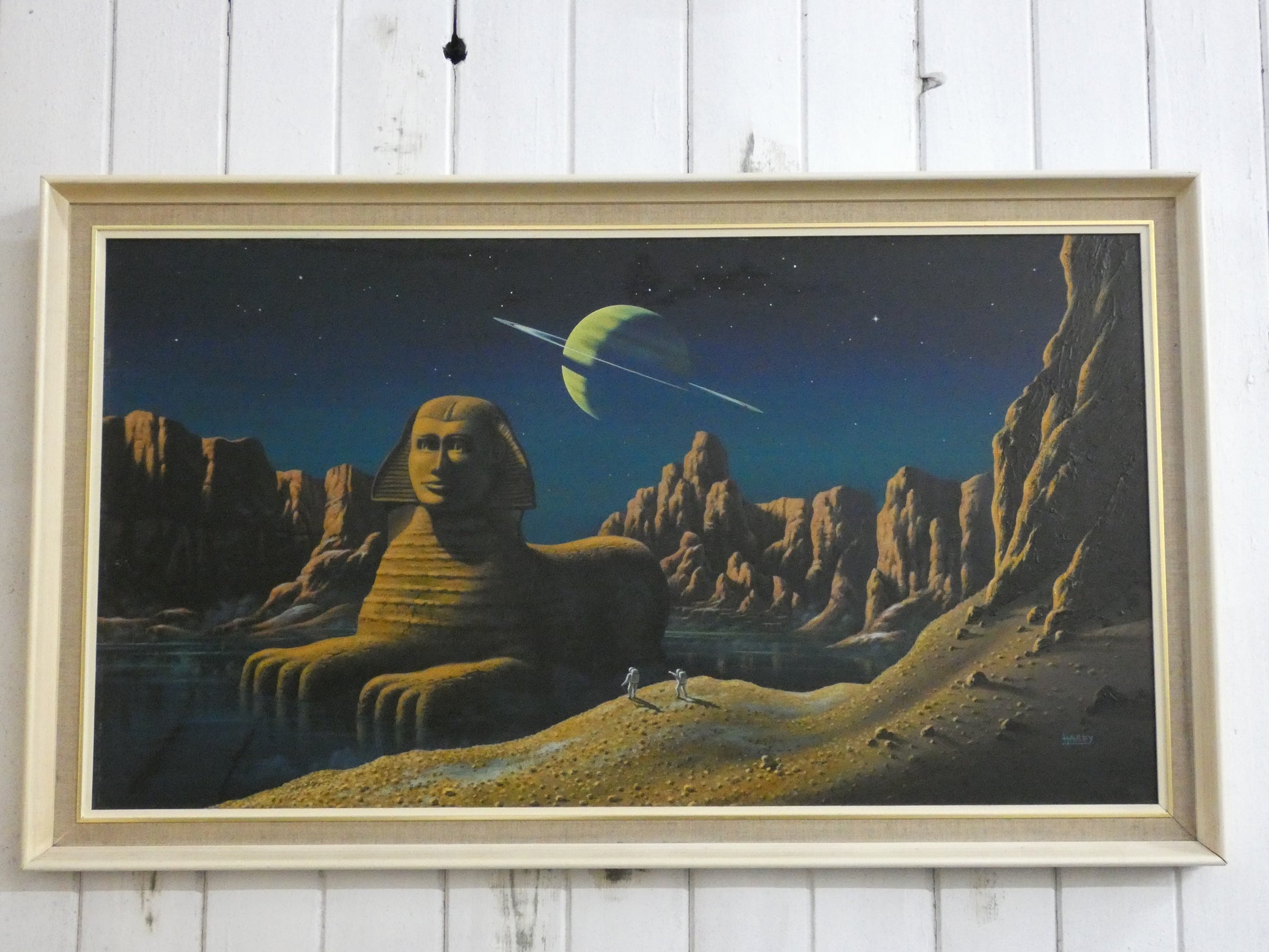 This surreal painting features the Great Sphinx of Giza set against an alien sky, illuminated by a massive ringed planet and scattered stars. The image evokes awe, mystery, and the spirit of retro futurism—perfect for fans of vintage sci-fi and imaginative world-building.