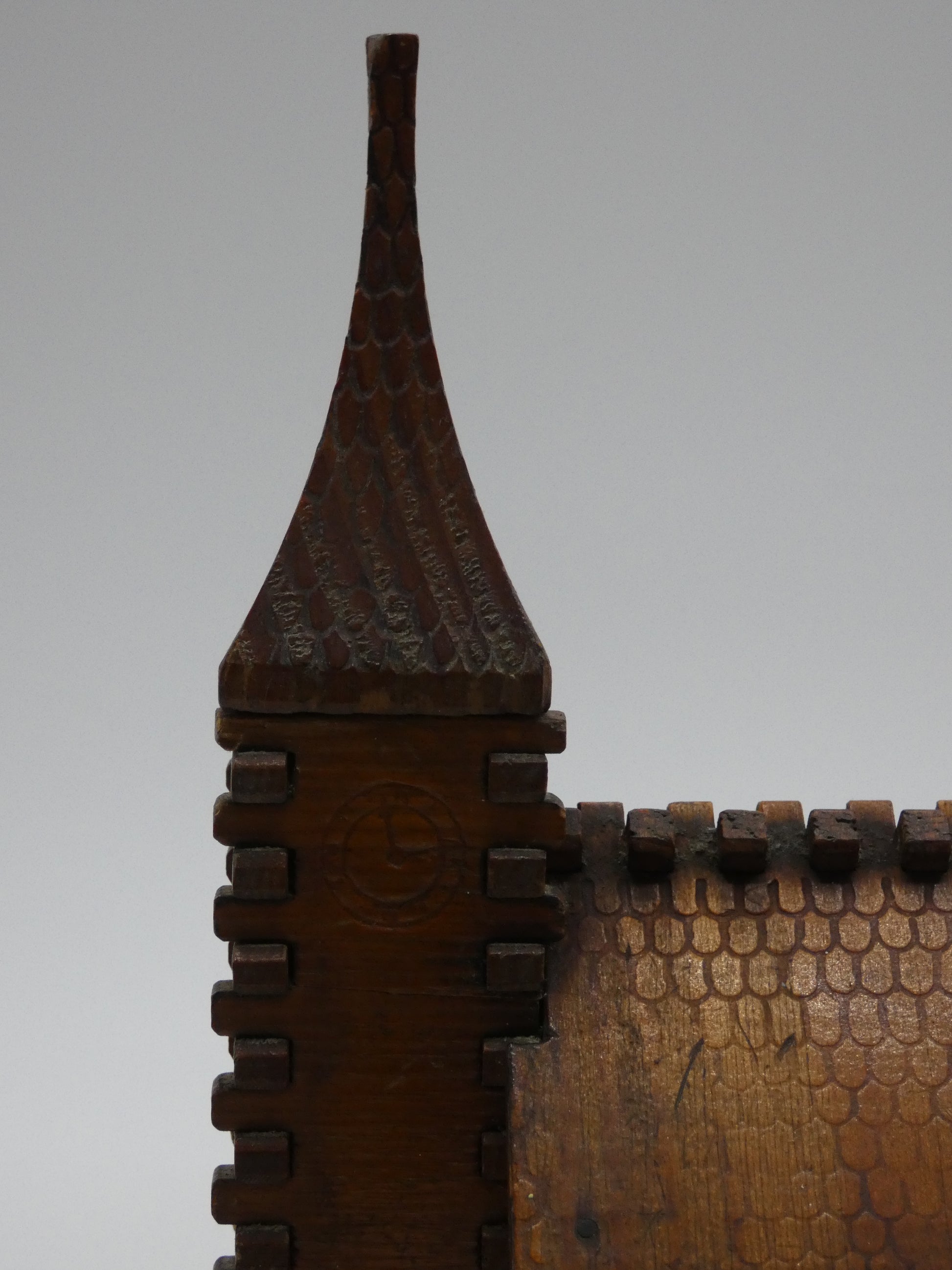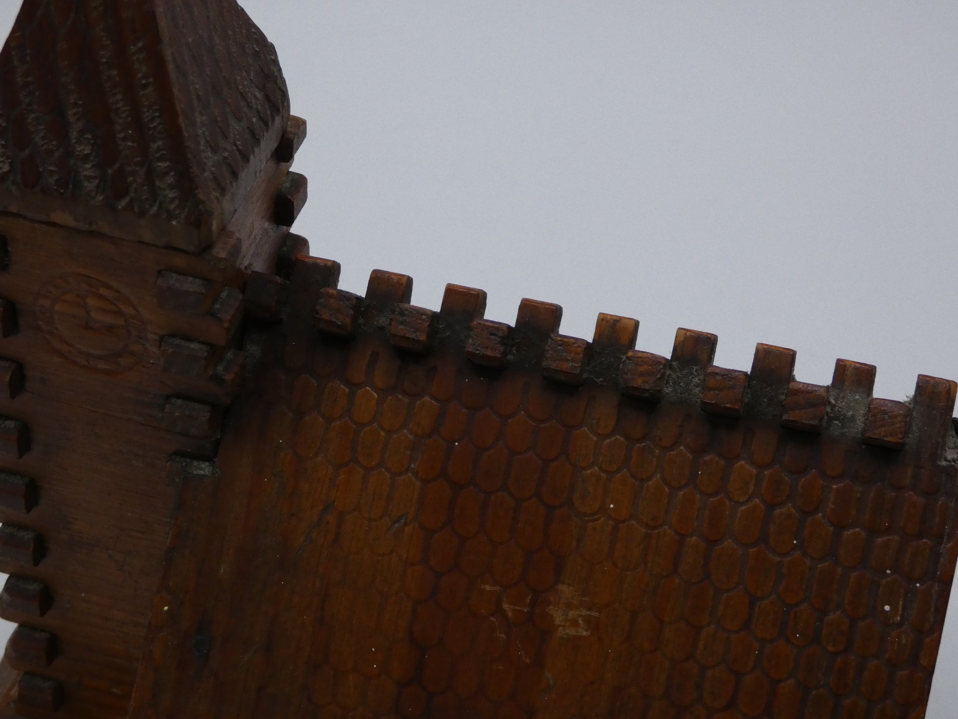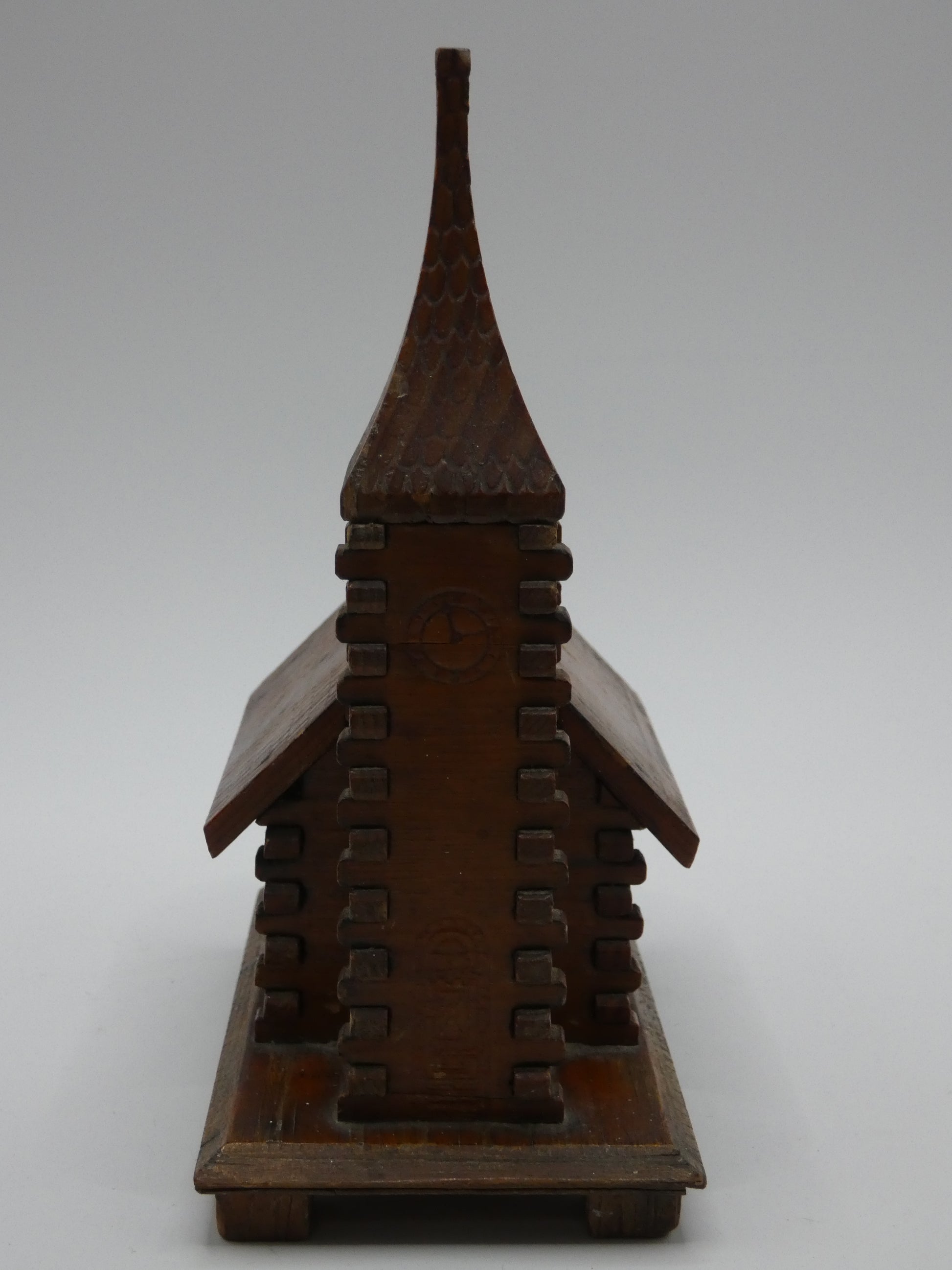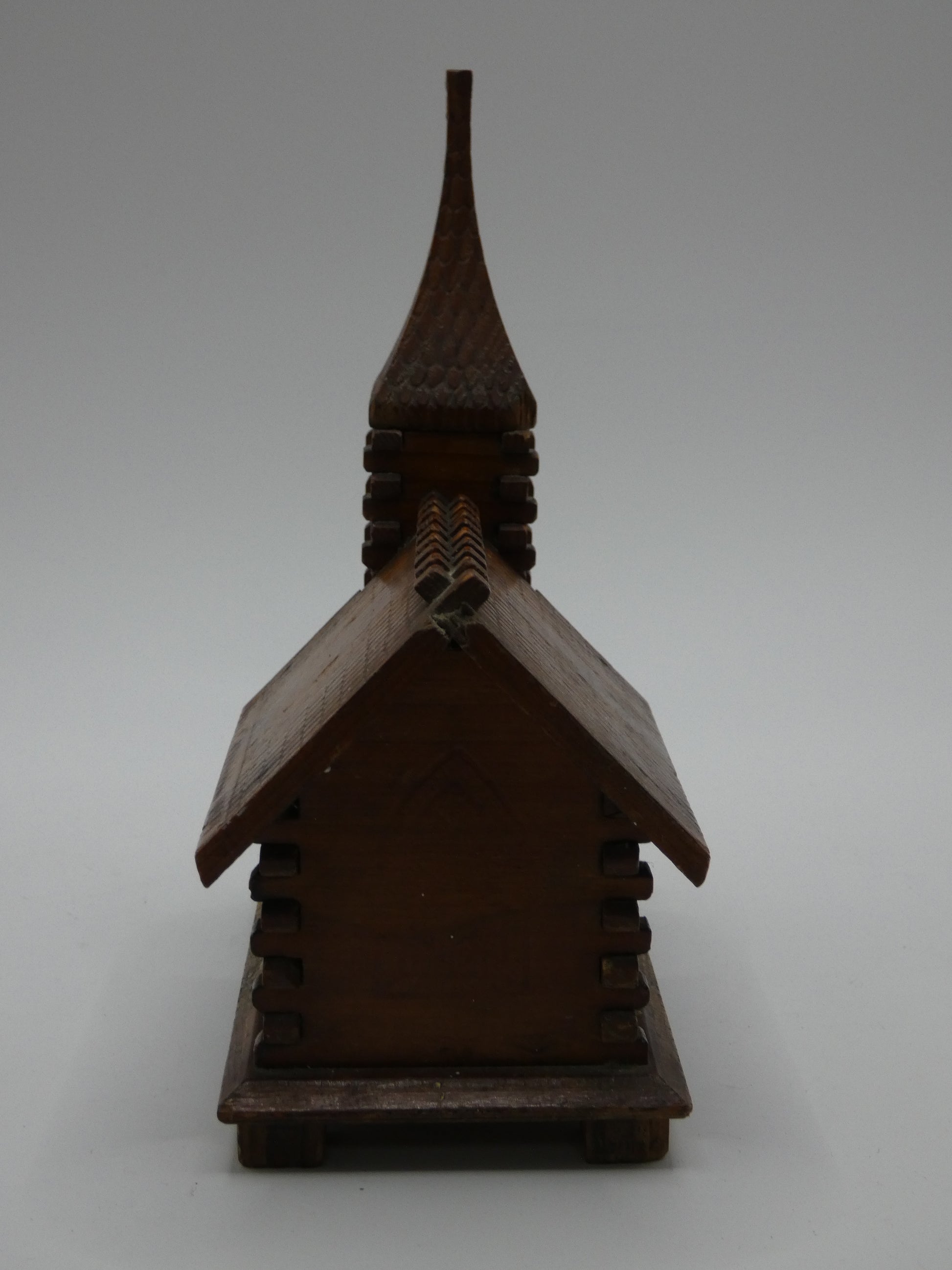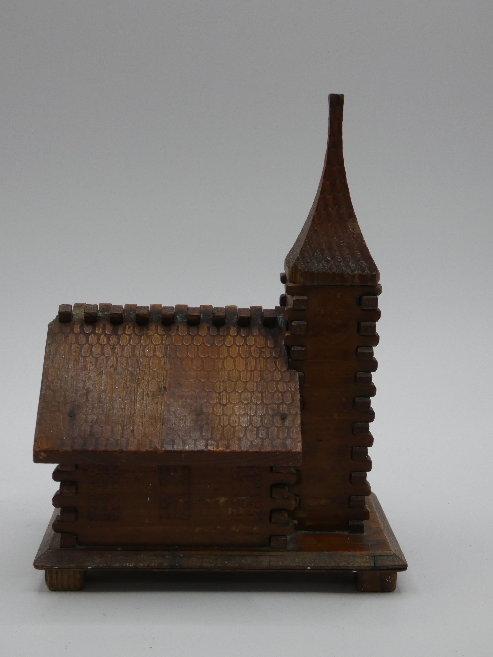 A truly charming vintage piece, this wooden folk art musical church is full of rustic character and handmade appeal. Beautifully detailed with a tall steeple and textured roof, it makes a lovely decorative ornament for a shelf, mantelpiece, or display cabinet.